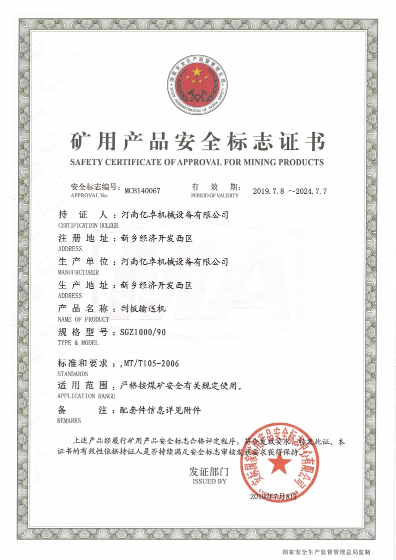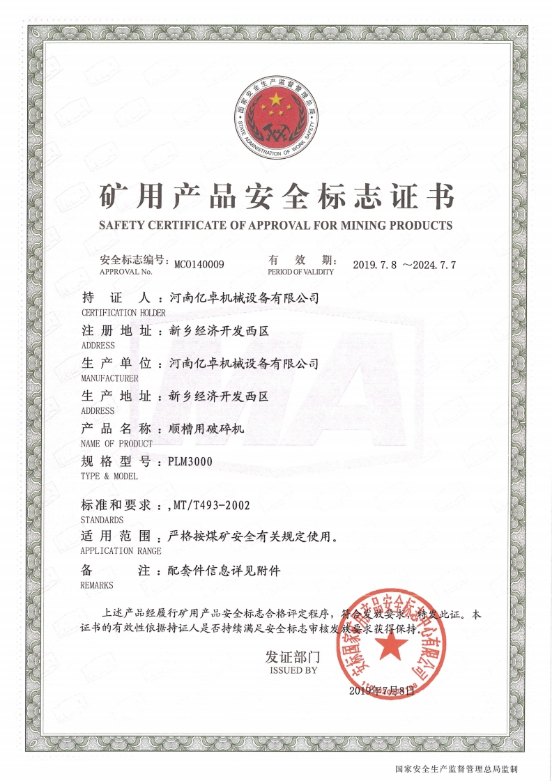 矿用产品安全标志证书